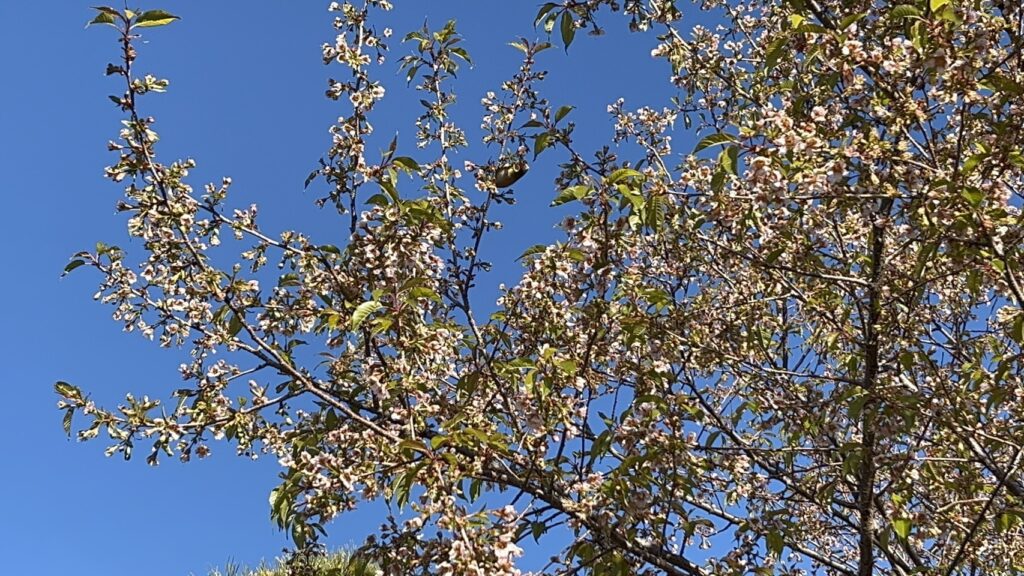 冬咲きの桜にメジロのつがいが来ていました。