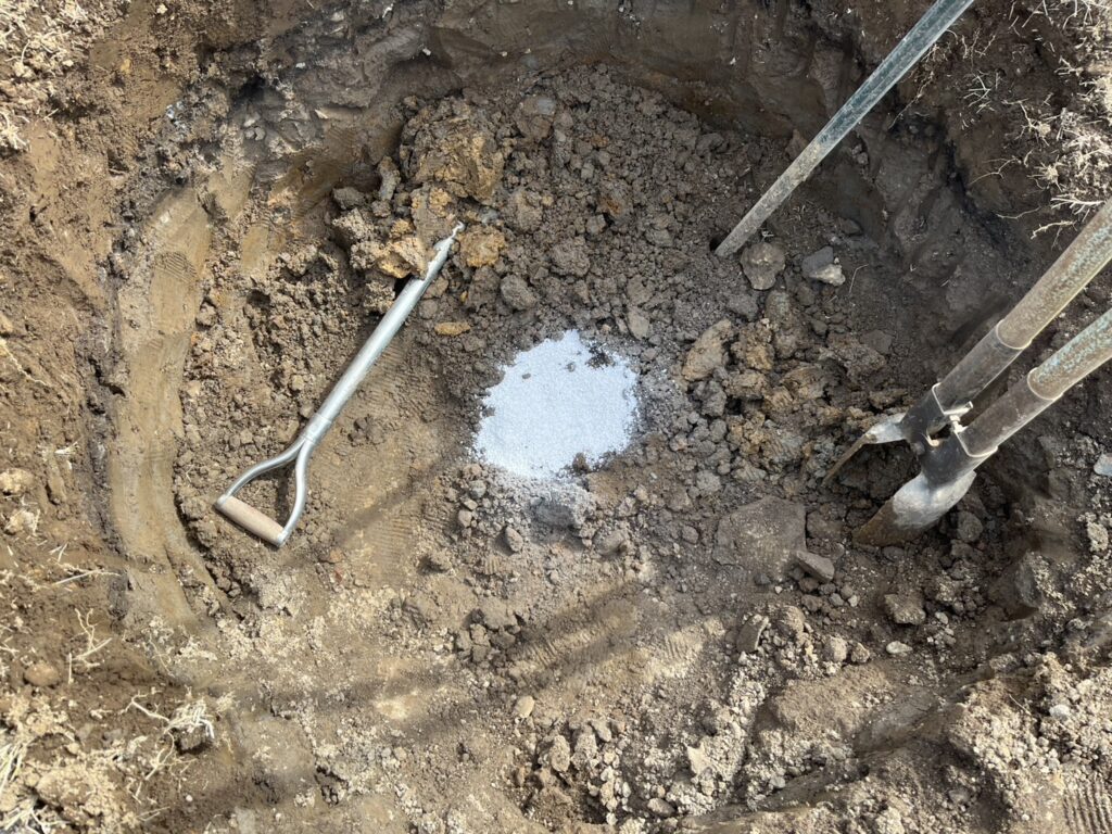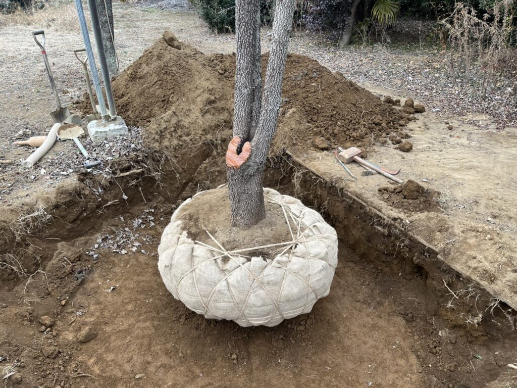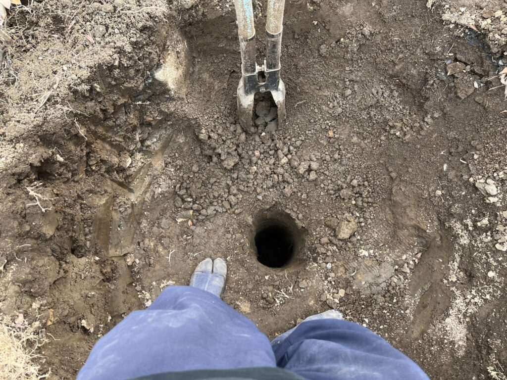 地域柄、土が硬く水捌けがあまりいい所ではないので、硬い層を抜けて下に水が染みこむように植え穴の中心に縦穴を掘り、土壌改良材を入れて植え穴水が溜まりにくい環境を作ります。